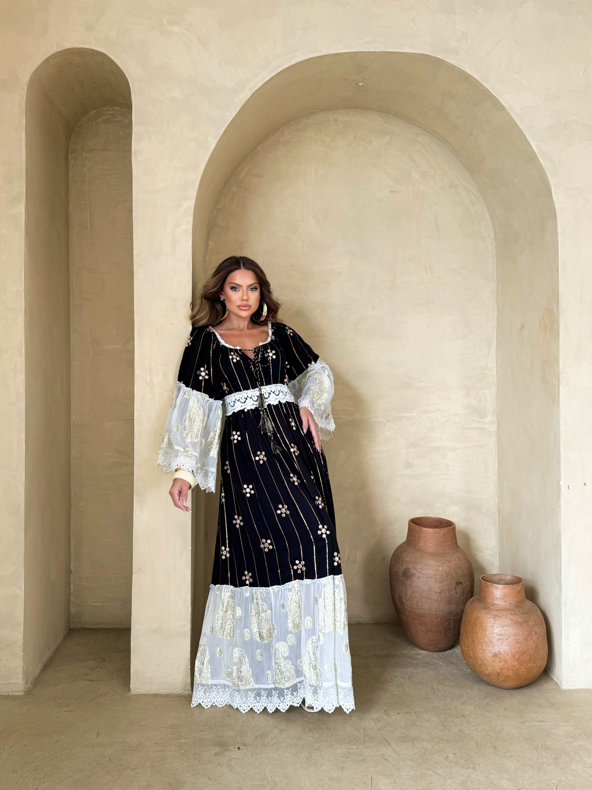 O nosso vestido longo com saia e detalhes em preto sutil e delicado é a peça-chave que toda mulher precisa em seu guarda-roupa. Com um design que exala sofisticação e charme, este vestido é ideal para ocasiões especiais, festas ou mesmo para uma saída casual que pede um toque de elegância.