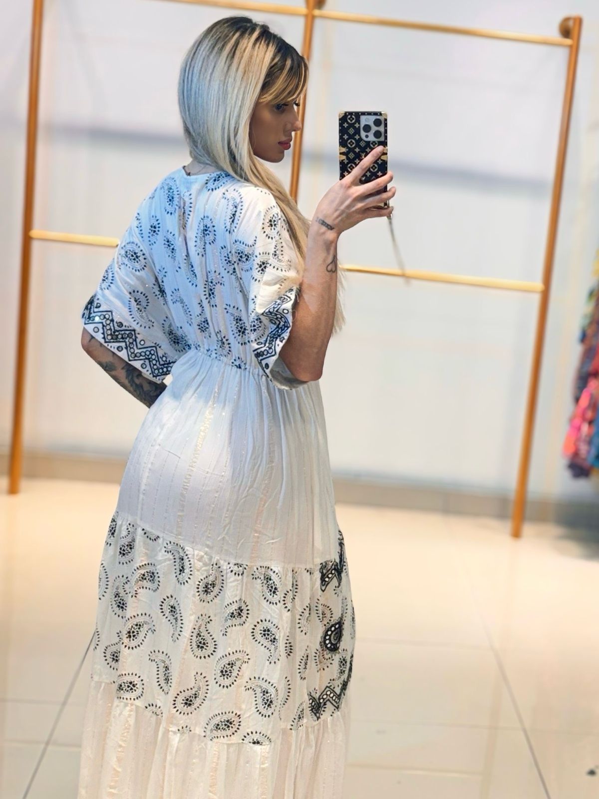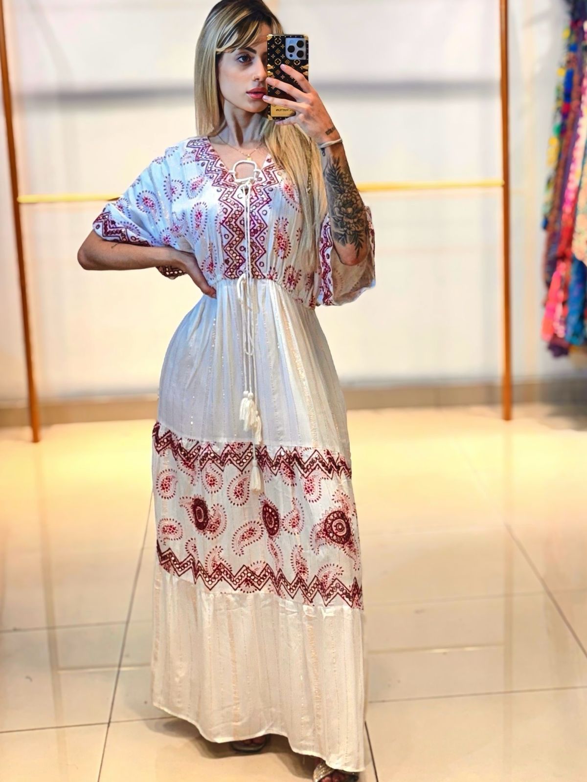Este vestido longo é a escolha perfeita para ocasiões especiais ou para um dia casual com estilo. Com detalhes delicados nas mangas e na saia, ele combina um design clássico com um toque moderno. A silhueta fluida do vestido permite conforto e liberdade de movimento, enquanto os elementos decorativos elevam a peça a um novo patamar. Seja para um casamento, um jantar ou um passeio, este vestido fará você brilhar em qualquer situação.