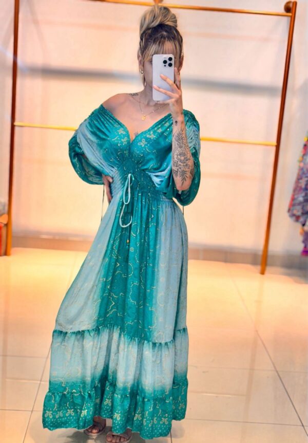 Descubra a beleza e sofisticação do nosso vestido longo em seda, projetado com mangas bufantes que acrescentam um toque de romance e charme. Sua textura suave e leve proporciona conforto durante todo o dia, enquanto o caimento fluido realça a silhueta de quem o veste. Ideal para eventos formais ou ocasiões especiais, este vestido é uma peça versátil que combina perfeitamente com acessórios elegantes. Transforme cada momento em uma lembrança inesquecível com esta peça essencial do seu guarda-roupa.